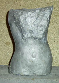 Het kleibeeldje stond model voor een grotere tors, die ik in de zomer van 1996 in Carrara (Italië) hakte. De steen (Carrara-marmer) haalde ik uit een groeve niet ver van de plaats waar eens Michelangelo het marmer voor zijn David uit de bergen haalde.