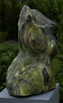 Nu viel mijn keuze op onyx, een riskante keuze. Weinig beeldhouwers maken van deze harde, snel splinterbare steen gebruik. Vooral in mijn geval was er een risico, omdat ik niet van machines gebruik maak. Het is dan noodzakelijk om al in een vroeg stadium met vijlen, raspen en schuurpapier in de weer te gaan. Verrassend bij het werken onyx is de transparantie van de steen: van te voren is het erg moeilijk om te zien hoe de uiteindelijk gepolijste kleuren er uit gaan zien.