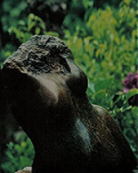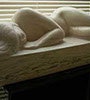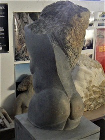 Van hetzelfde model hakte ik uit een rechthoekig stuk Franse kalksteen uit de Dordogne een vrijwel identiek beeld. Ik wilde weten welk effect een ruwere, niet polijstbare steen op een dergelijk delikaat onderwerp zou hebben. De aard van de steen bracht met zich mee dat ik in dit geval de haren in een soort scheplvorm liet uitwaaieren.
