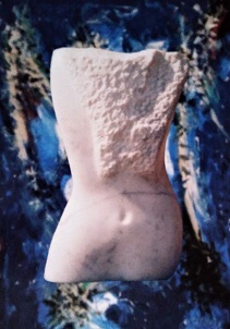 Het kleibeeldje stond model voor een grotere tors, die ik in de zomer van 1996 in Carrara (Italië) hakte. De steen (Carrara-marmer) haalde ik uit een groeve niet ver van de plaats waar eens Michelangelo het marmer voor zijn David uit de bergen haalde.