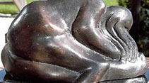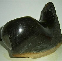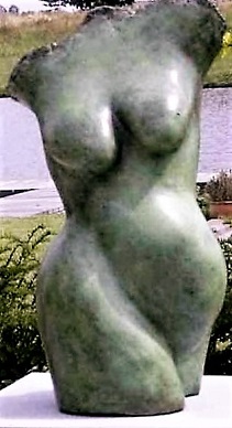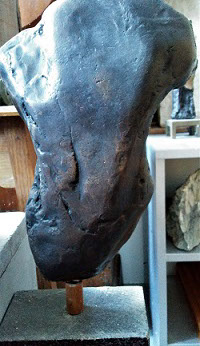 Deze bruin-zwarte steen, die erom vroeg tot een tors te worden omgetoverd, trok me vooral aan door de specifieke scheve vorm. Die wilde ik in elk geval in stand houden. Het zou dus een half liggende tors moeten worden. In alle eenvoud straalt er een enorme rust van dit beeld uit. Het was het eerste beeld dat ik verkocht op een expositie aan de Bonairepier: 'Kunst in Kunst'. Ik had er moeite mee omdat ik erg aan dit beeld was gehecht.
