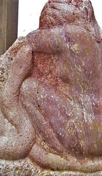 Het ene beeld is gehakt uit Belgisch hardsteen, dat ik gevonden heb in een container bij een steenhouwer. Tezamen met de dubbele sokkel, waar ik lotusbloemen en een slang in reliëf heb uitgehakt - met daarboven kommetjes voor olie en het branden van wierook - heeft dit beeld de functie van een altaar.
